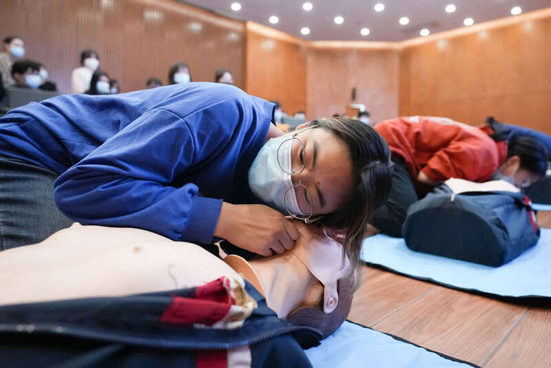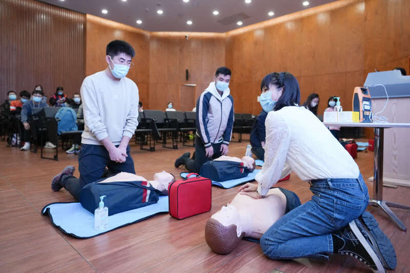 ↑11月28日,清华大学医院医生李晶铃(右一)在为学生志愿者讲授心肺复苏术。