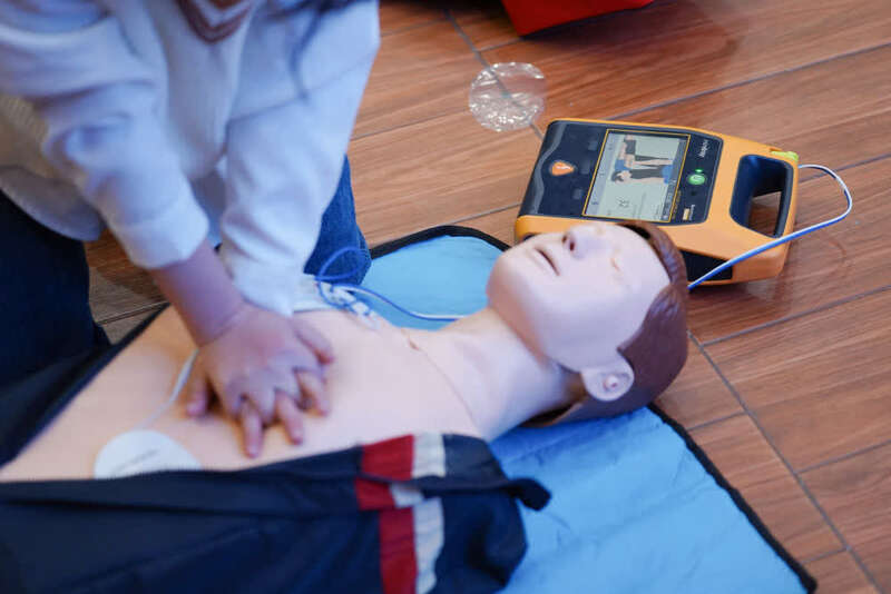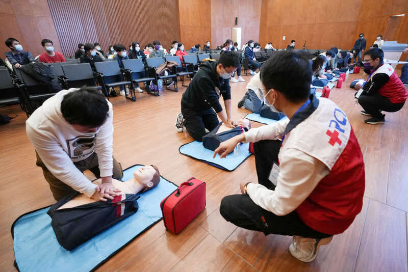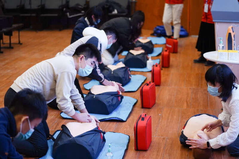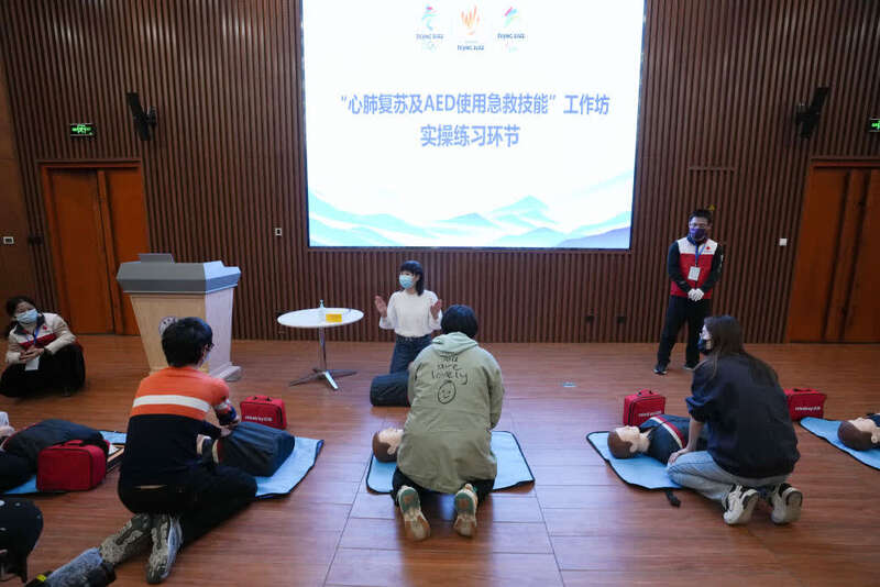 ↑11月28日,冬奥学生志愿者在急救技能培训上学习心肺复苏术。