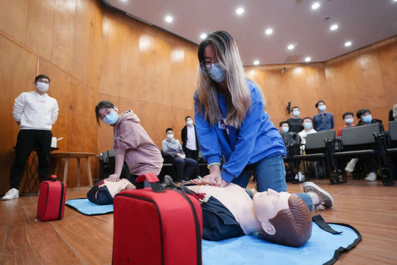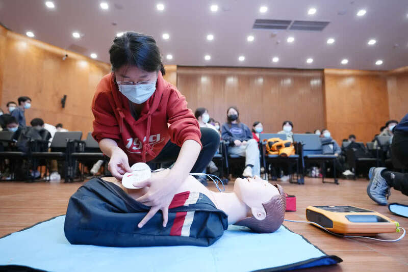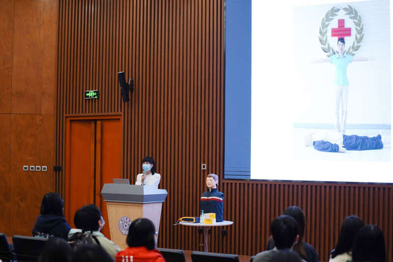 ↑11月28日,清华大学医院医生李晶铃为学生志愿者讲授急救知识。
