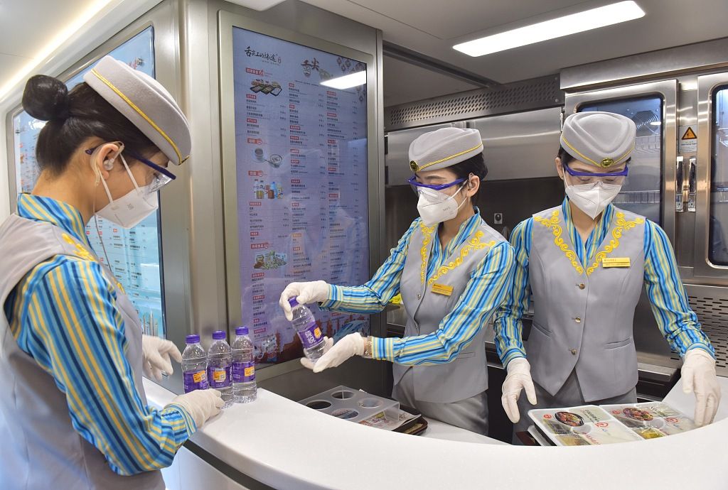 2021年12月1日上午,从深圳北站开往赣州西的试运行列车上,乘务员在餐车内备餐。李坚强 摄