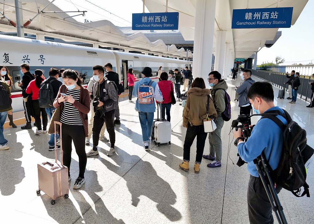 2021年12月1日,媒体记者乘坐G4582次高铁从深圳北开往赣州西的试运行列车进行体验。赣深高铁全线通车进入倒计时。图为记者乘坐赣深高铁试运行列车抵达赣州西站。 中新社记者 陈文 摄