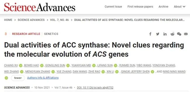 日前,南开大学生命科学学院王宁宁教授团队联合南开大学药物化学生物学国家重点实验室、细胞应答交叉科学中心的结构生物学家饶子和院士团队与美国内华达大学生物信息学家Jeffery Shen教授,在Science子刊Science Advances在线发表了题为“Dual activities of ACC synthase: Novel clues regarding the molecular evolution of ACS genes” 的研究论文,为揭示乙烯合成关键酶ACS的分子演化路径带来了新线索。