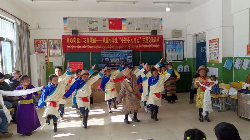 活动现场,两所学校的师生起立共同唱响国歌。在童绘一幅童心筑梦图画环节,两地的孩子们收到了爱心家长们精心准备的哈达和羽绒背心。孩子们还相互结对,互赠一幅童心筑梦主题图画。柳乡中心小学和望湖小学学生分别表演舞蹈《欢歌齐舞》《少年》。柳乡中心小学教师还为孩子们带来了藏族舞蹈《后藏姑娘》。