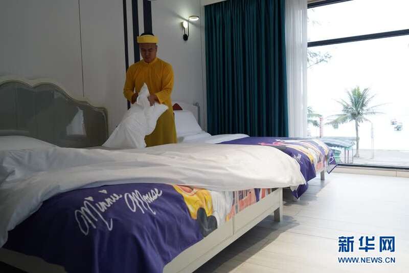 冬日的金滩,海风拂面,阳光轻柔。一大早,京族小伙苏运晟就在自家的民宿里收拾打扫。现在虽不是旅游旺季,但周末即将到来,仍会有不少游客自驾来金滩旅游。