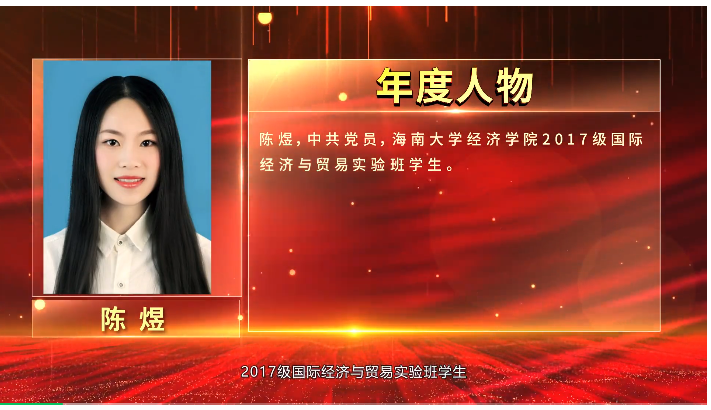 陈煜,女,汉族,中共党员,海南大学经济学院2017级国际经济与贸易实验班学生,本科在校三年期间综合绩点排名第一,荣获国家奖学金、海南大学特等奖学金、海南大学一等奖学金,目前已保送至华中科技大学。 2019-2020学年度担任海南大学经济学院团委学生副书记、青年志愿者协会会长,免费午餐海南省大学生总驿站站长。 荣获第五届中国“互联网+”大学生创新创业大赛全国银奖、第六届中国国际“互联网+”大学生创新创业大赛全国银奖、第五届中国“互联网+”大学生创新创业大赛全国铜奖、中国青年志愿服务项目大赛铜奖等6项国家级奖项,先后共获得10余项省级及以上奖项。