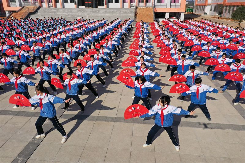 2021年12月2日,江西省吉安市新干县城东学校学生正在进行太极扇大课间活动展演。