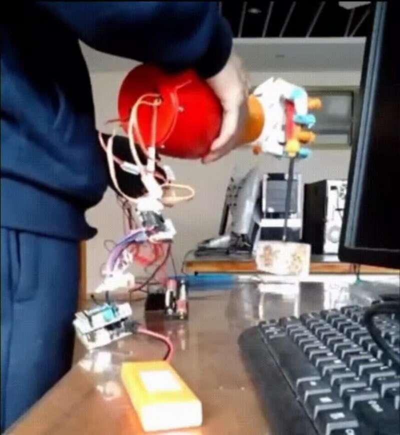 到了高中,朱政扬才明白电视机的运作原理。那时,他已经是无锡市第一中学首届科技特长班的学生,学校给他们提供了专业的科技指导课程和大量的实践操作机会,也正是在高二那年,他关注到了残疾人远程取物的不便,设计出了可根据操作者手部动作仿生控制的“机械手”。