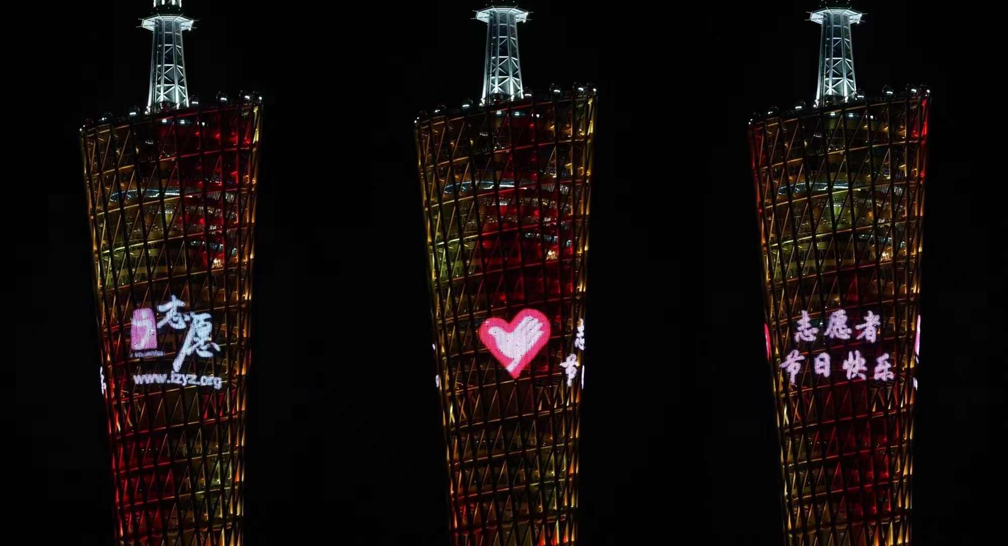 12月5日晚,广州塔、广州国际媒体港、珠海歌剧院、东莞CBD、佛山、江门等地标式建筑上,集体亮起“志愿者节日快乐!”“志愿者,谢谢你”光幕。