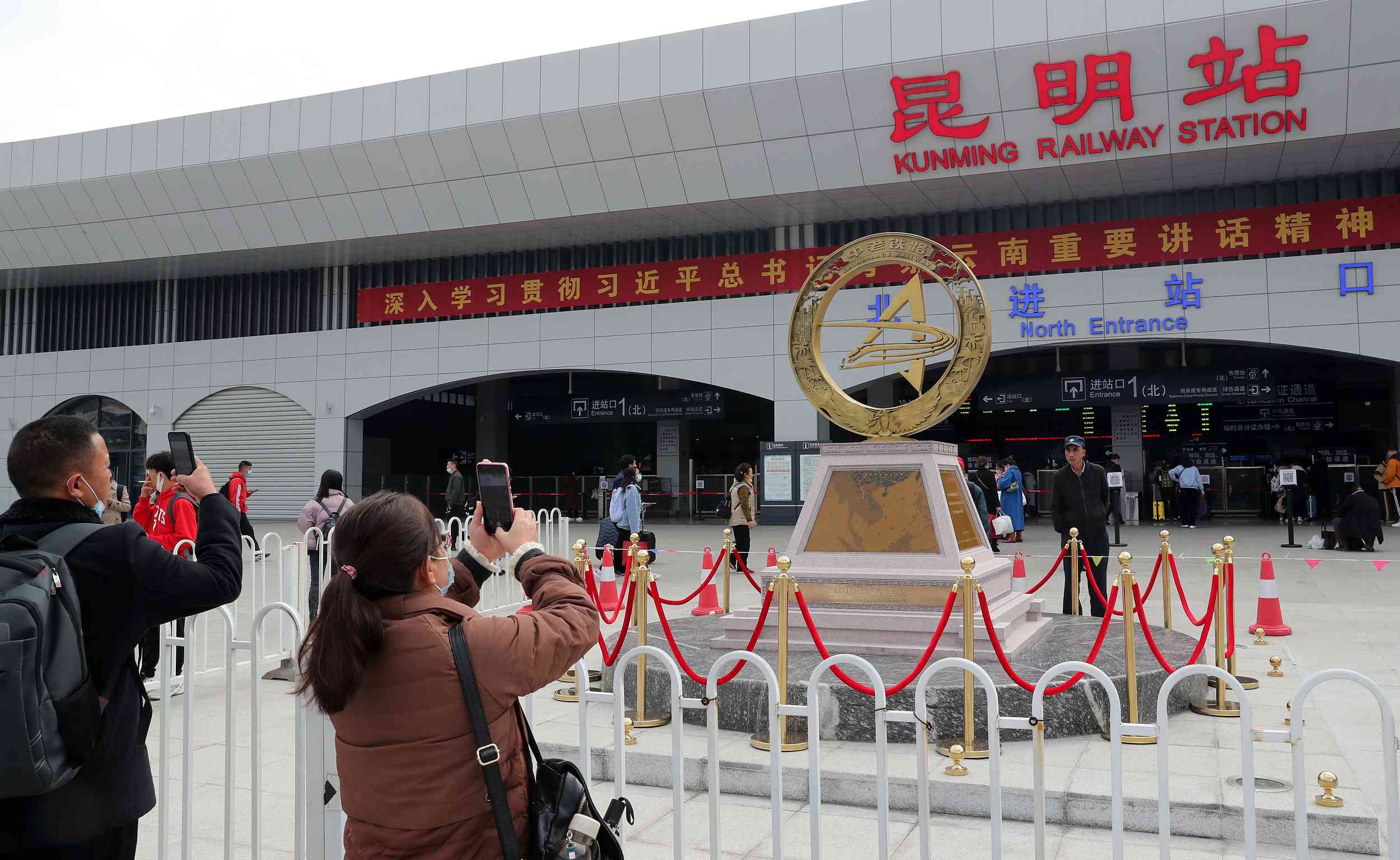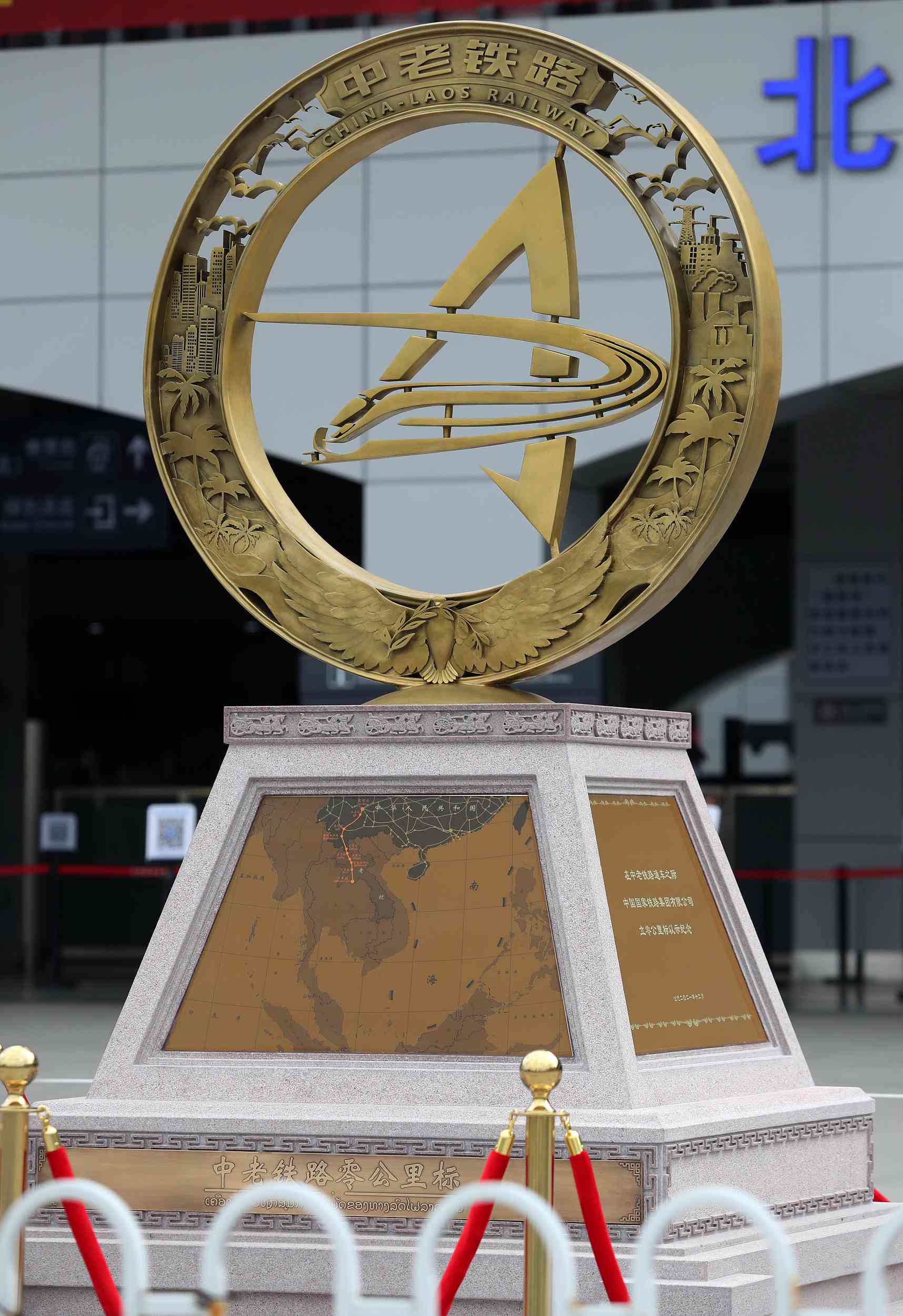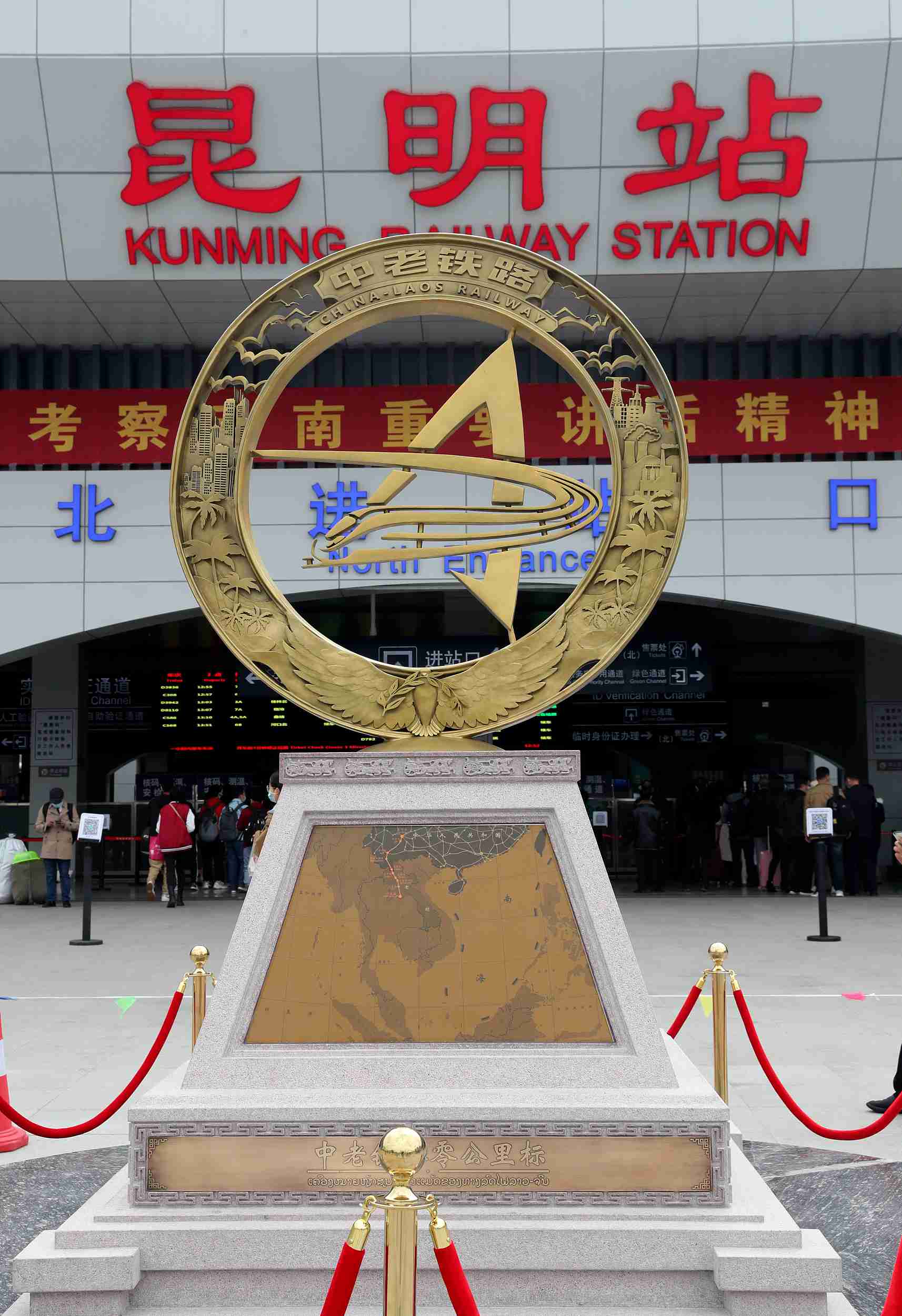 2021年12月5日,云南省昆明市,在昆明站北进站口广场,“中老铁路零公里标”纪念碑吸引路过市民和乘车旅客驻足拍照。中老铁路正式开通,“中老铁路零公里标”纪念碑也成为昆明站北广场的标志。