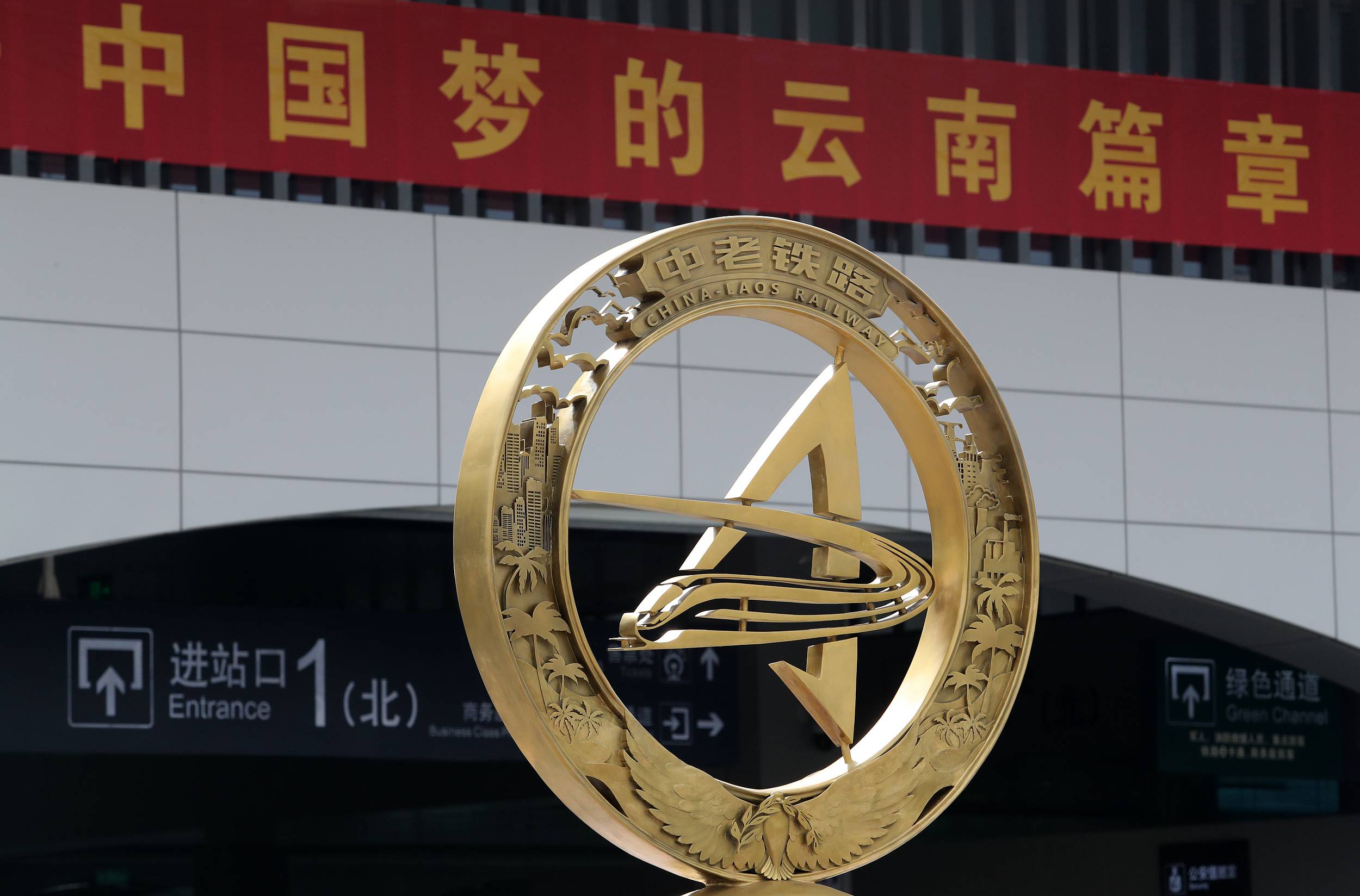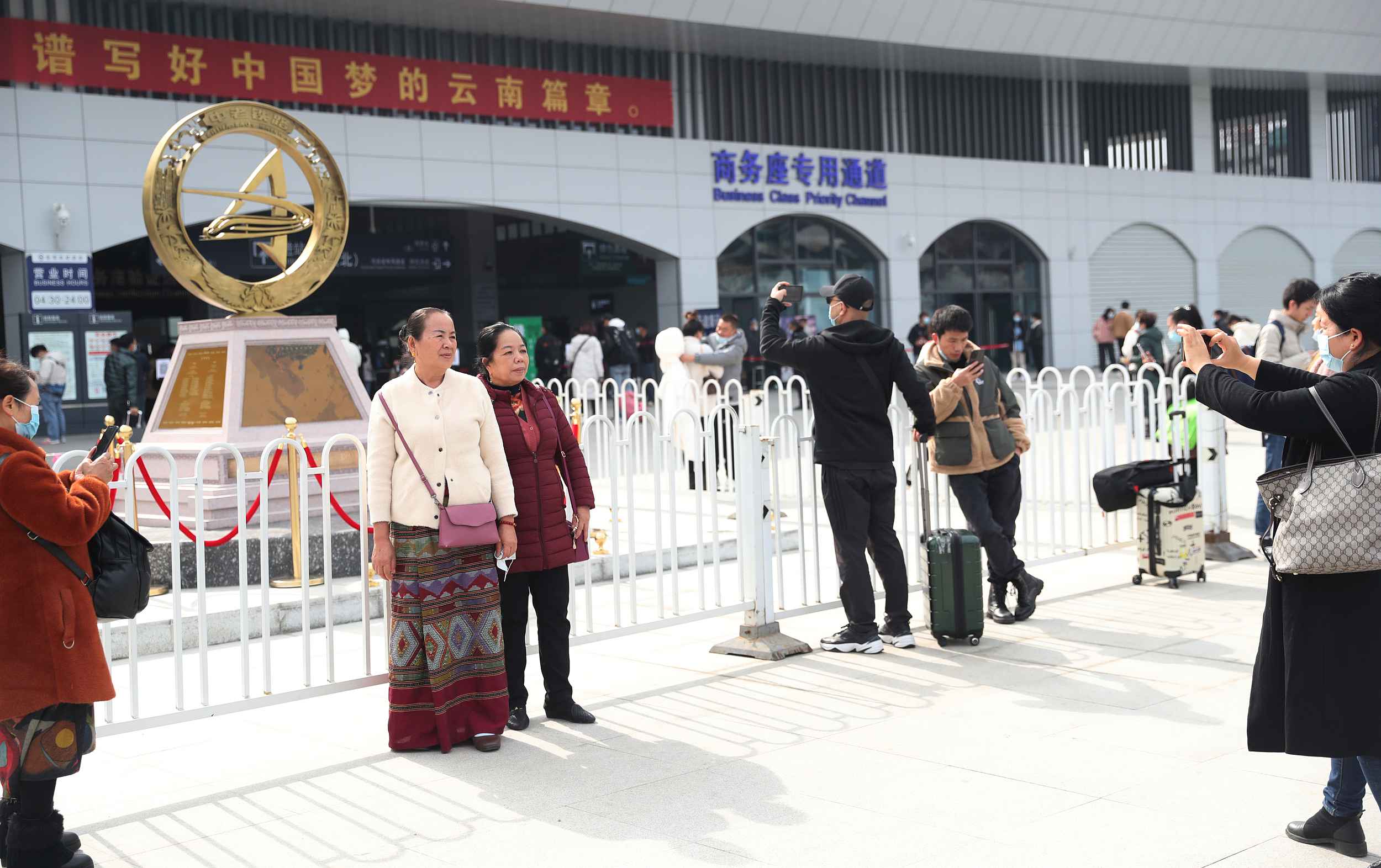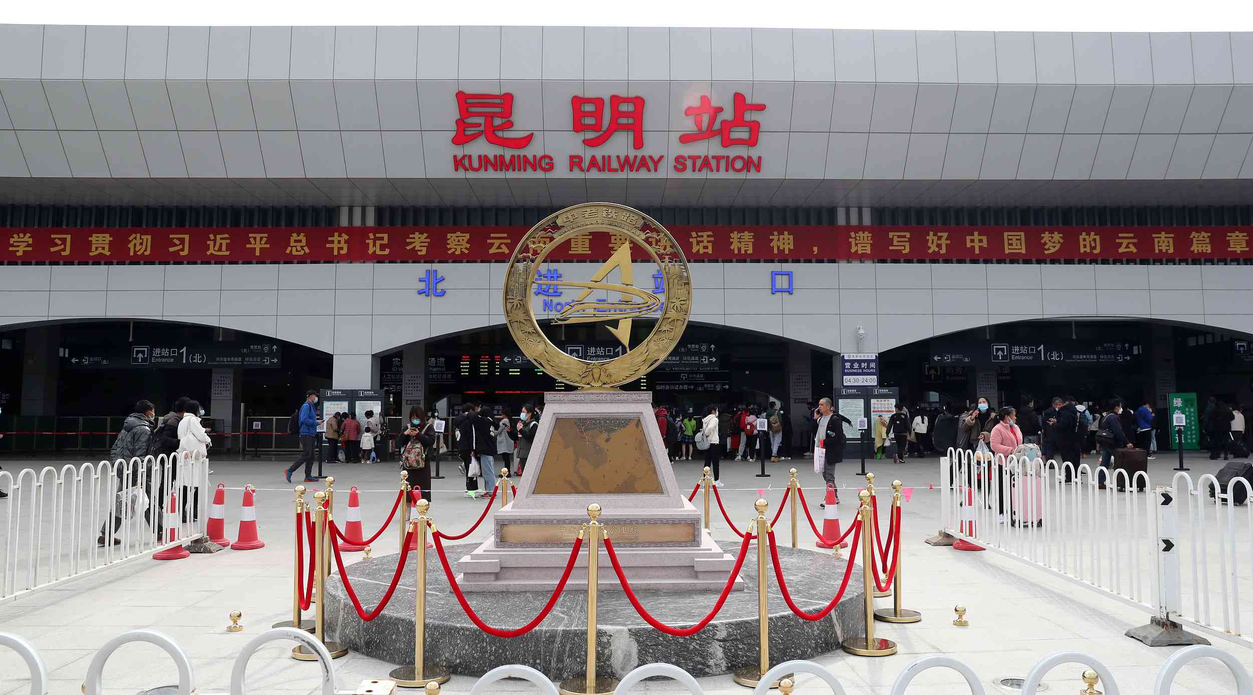 2021年12月5日,云南省昆明市,在昆明站北进站口广场,“中老铁路零公里标”纪念碑吸引路过市民和乘车旅客驻足拍照。中老铁路正式开通,“中老铁路零公里标”纪念碑也成为昆明站北广场的标志。