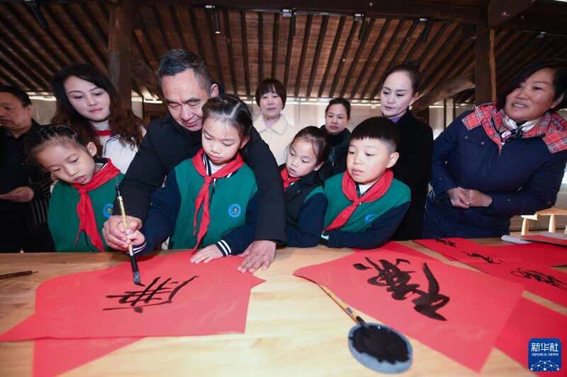 12月5日,高虹镇廉政文艺宣传队队员们带领高虹小学学生书写清廉家风书法作品。