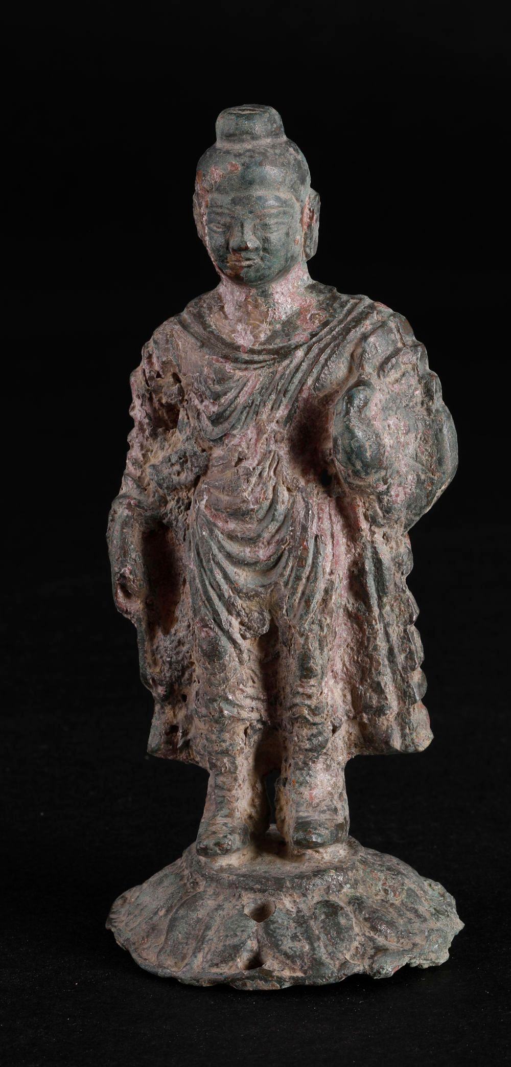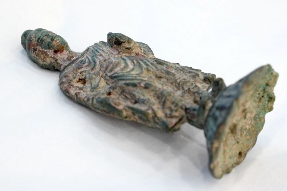 这是在咸阳市渭城区成任墓地出土的金铜释迦牟尼立像(4月18日摄)。新华社发(陕西省考古研究院供图)