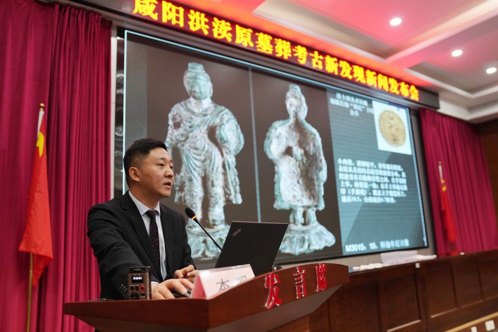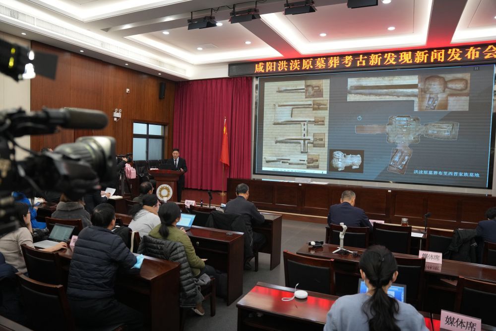 ↑12月9日,咸阳洪渎原墓葬考古新发现新闻发布会在陕西省文物局举行。
