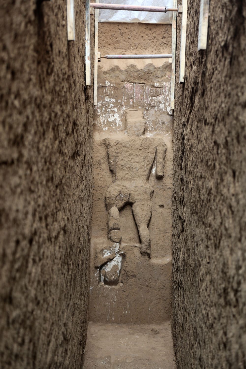 ↑这是在咸阳市渭城区西蒋墓地M4070墓道北壁发现的土雕人像(2月23日摄)。新华社发(陕西省考古研究院供图)