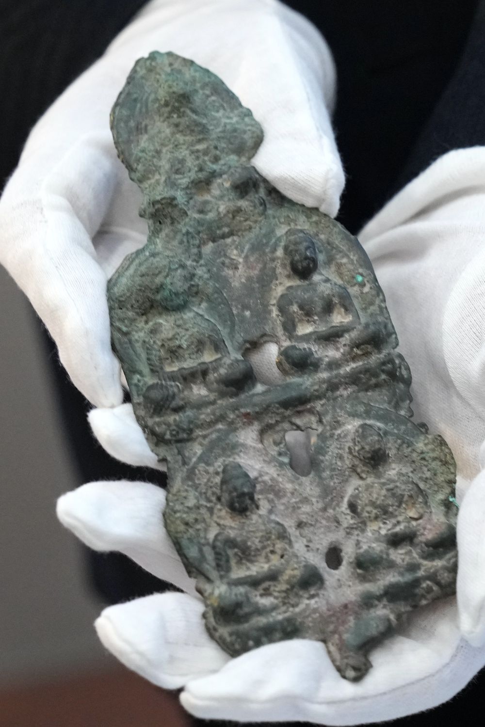 ↑这是在咸阳市渭城区唐杨全节墓出土的左内率铜鱼符(10月13日摄)。新华社发(陕西省考古研究院供图)