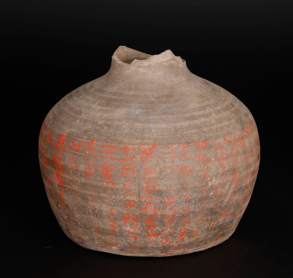 ↑这是在咸阳市渭城区成任墓地出土的延熹元年朱书陶罐(5月20日摄)。新华社发(陕西省考古研究院供图)