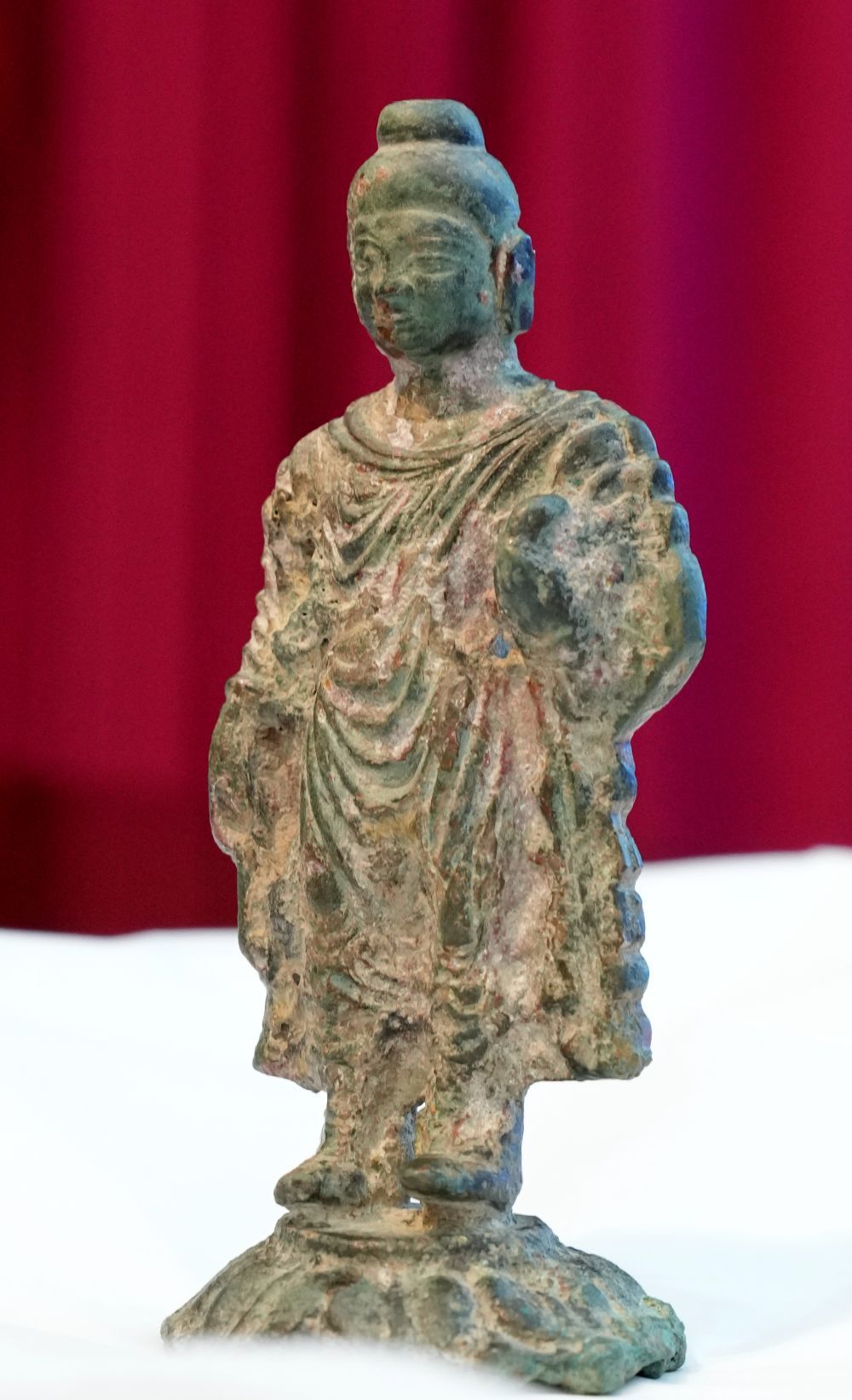 ↑咸阳洪渎原墓葬考古发现的金铜释迦牟尼立像(12月9日摄)。