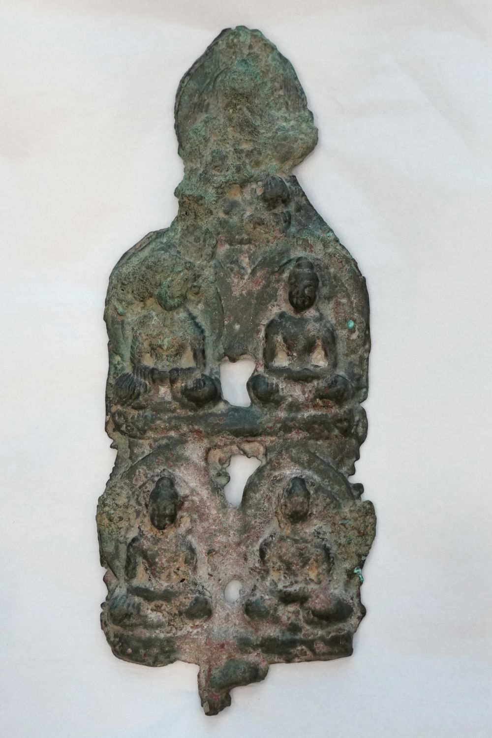 ↑咸阳洪渎原墓葬考古发现的金铜五尊佛像(12月9日摄)。