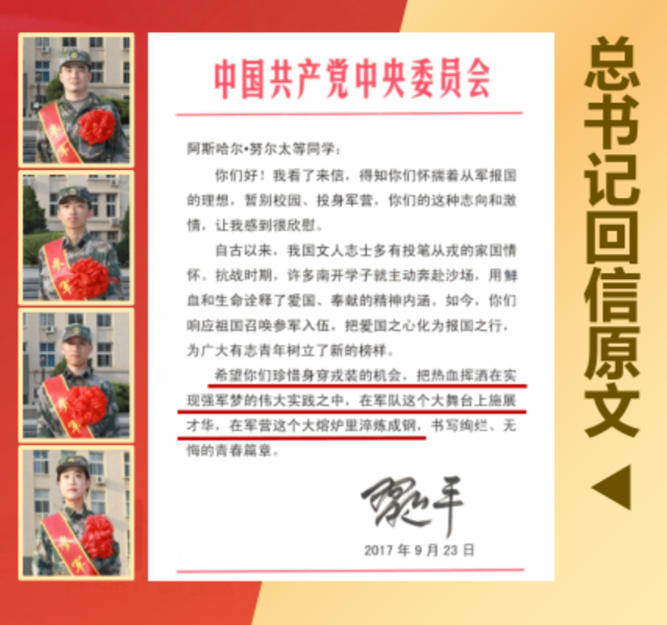 习总书记给南开学子的回信和发起“公能星火”校军融合-强军人才培养前哨站公益项目的四学子。