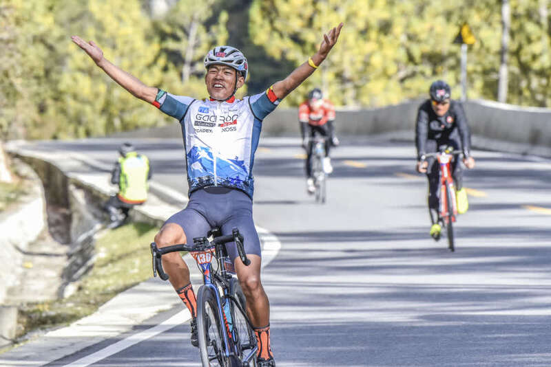 ↑这是吐尔松江·布尔力克(前)在骑闯天路高海拔自行车极限赛中(2018年10月14日摄)。