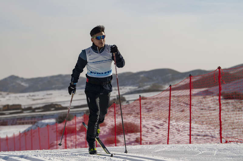 ↑这是吐尔松江·布尔力克在新疆温泉县越野滑雪场训练(2021年11月25日摄)。