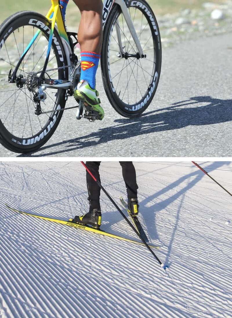 ↑拼版照片:上图为第十一届环赛里木湖公路自行车赛前,吐尔松江·布尔力克在温泉县的一处乡村公路上练习(2017年5月29日摄);下图为吐尔松江·布尔力克 随越野滑雪国家集训队在新疆温泉县越野滑雪场训练(2021年11月25日摄)。