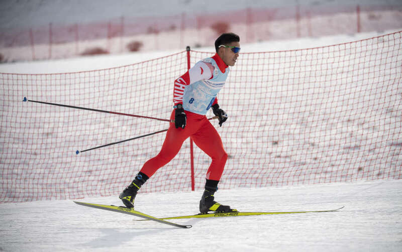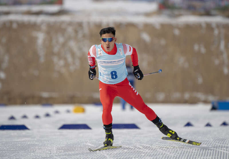 ↑这是在新疆温泉县越野滑雪场拍摄的越野滑雪国家集训队运动员吐尔松江·布尔力克(2021年11月22日摄)。