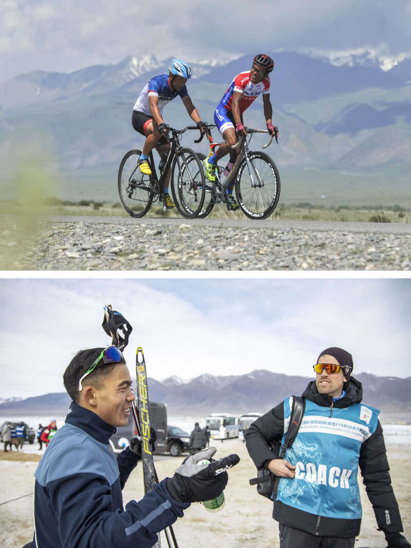 ↑拼版照片:上图为吐尔松江·布尔力克(右)和自己的师傅赵勇在温泉县的一处乡村公路上练习备赛(2017年5月29日摄);下图为吐尔松江·布尔力克(左)和越野滑雪国家集训队教练巴赫交流训练情况(2021年11月22日摄)。