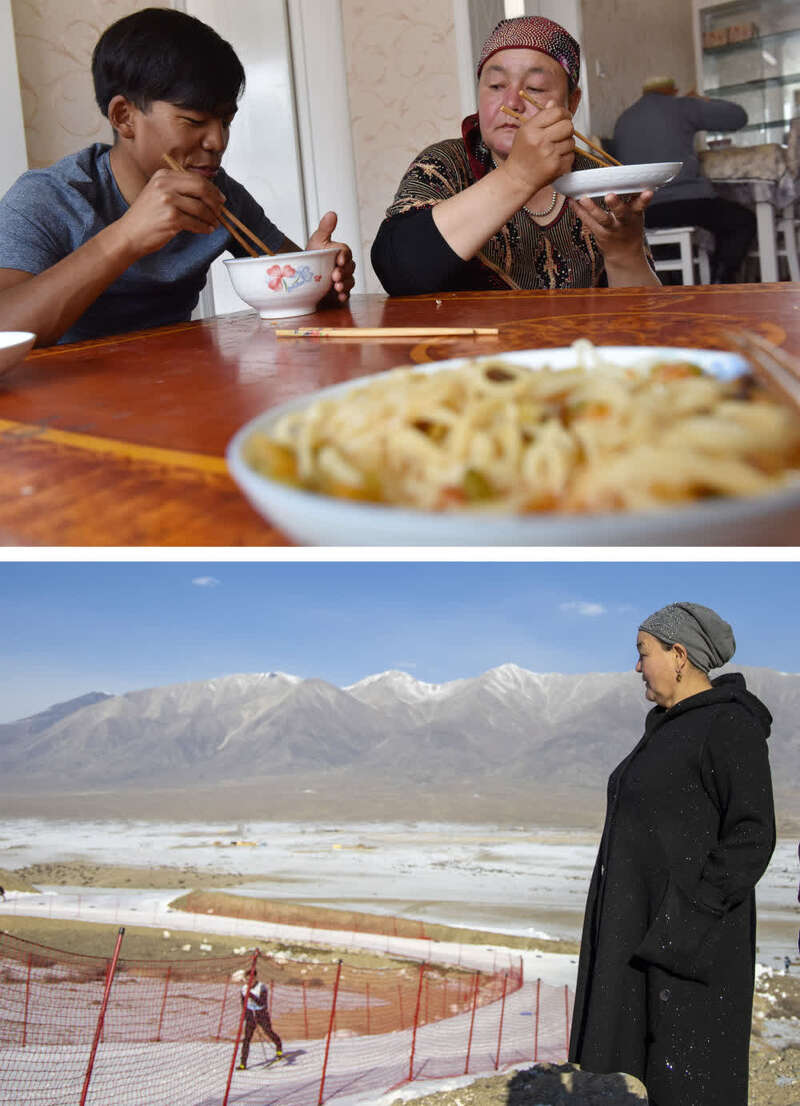 ↑拼版照片:上图为第十一届环赛里木湖公路自行车赛前,吐尔松江·布尔力克和母亲在家中吃饭(2017年5月29日摄)。此前在家备战自行车赛时,有时一天四顿,都是母亲负责;下图为吐尔松江·布尔力克的母亲在温泉县越野滑雪场的山上观看儿子比赛(2021年11月23日摄)。