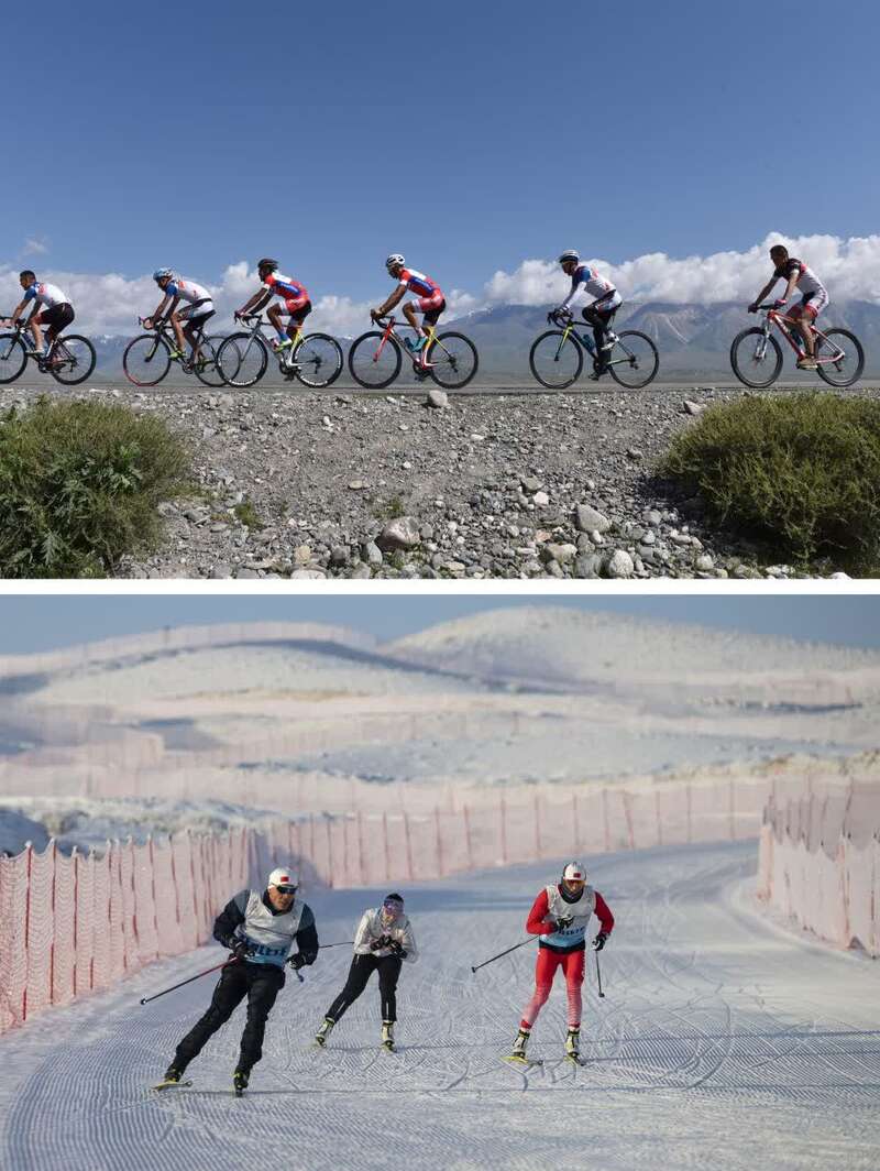 ↑拼版照片:上图为第十一届环赛里木湖公路自行车赛前,吐尔松江·布尔力克在温泉县的一处乡村公路上练习(2017年5月29日摄);下图为吐尔松江·布尔力克随越野滑雪国家集训队在新疆温泉县越野滑雪场训练(2021年11月25日摄)。