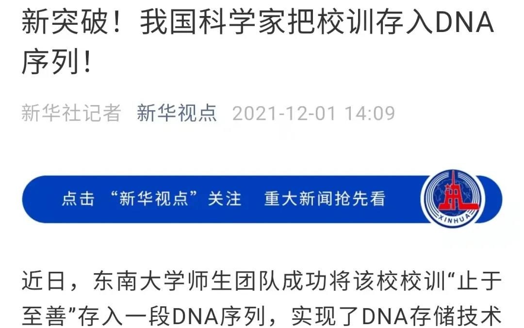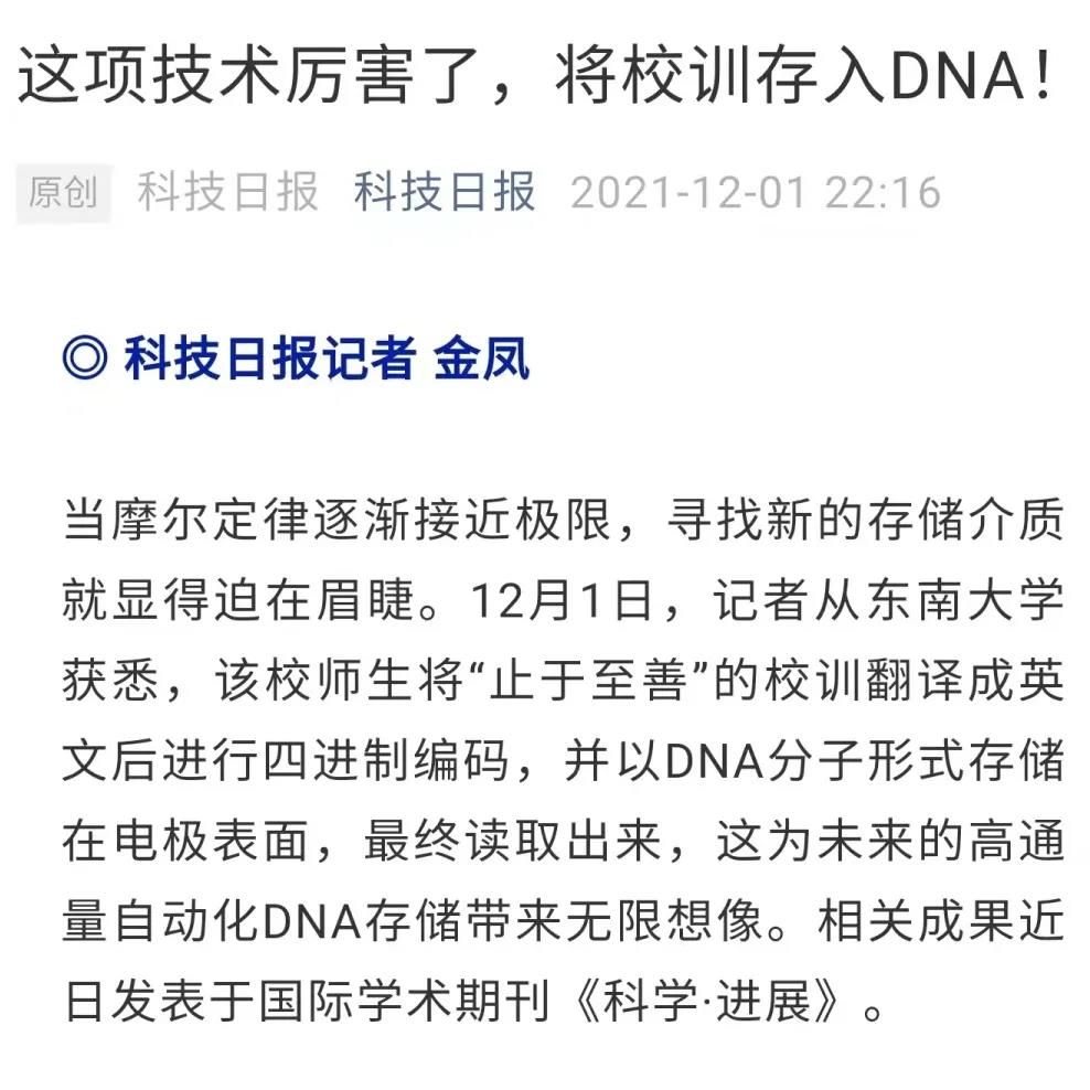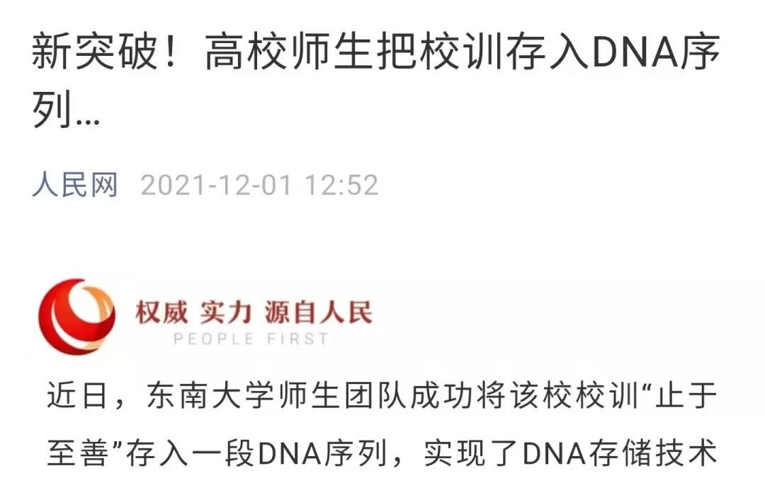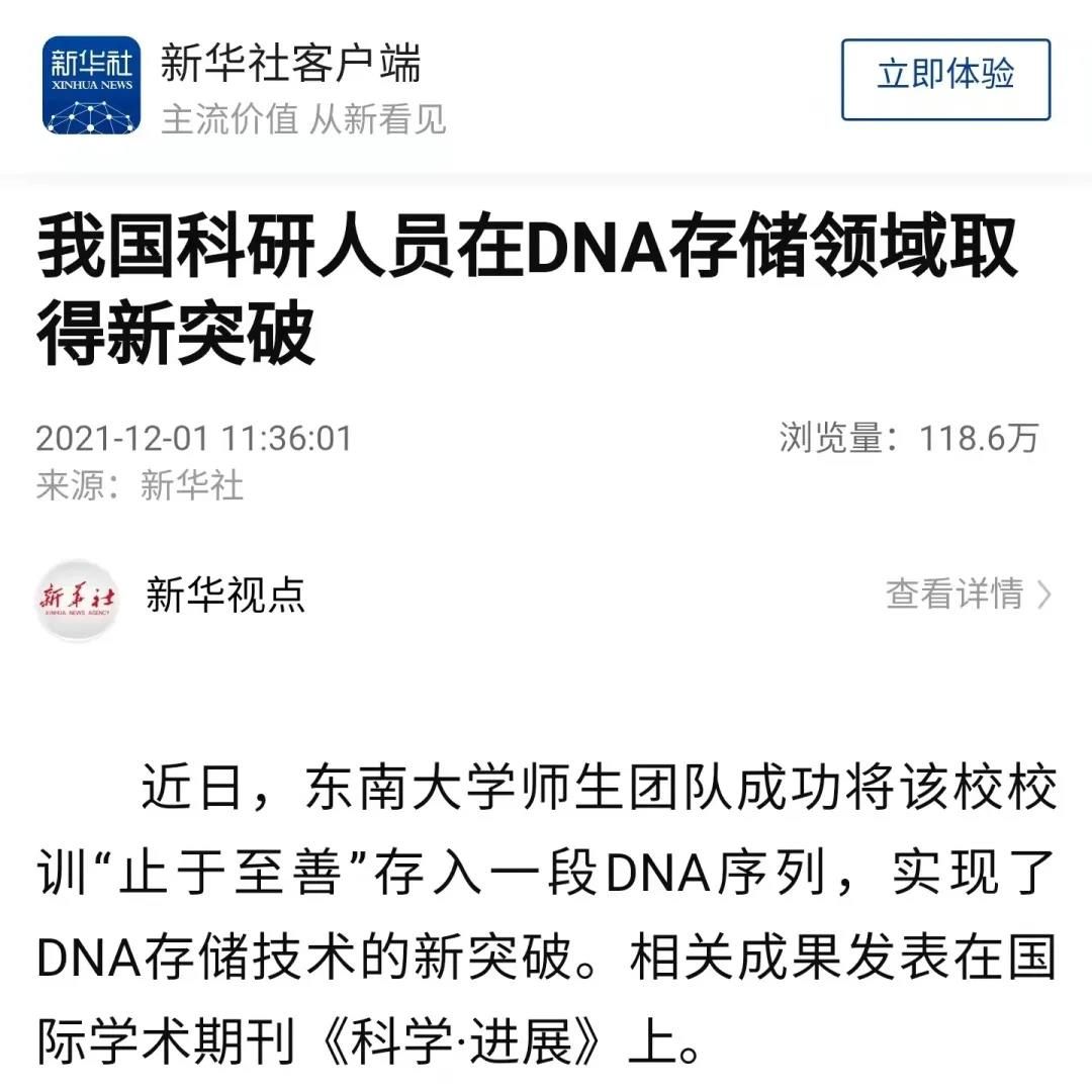 近日,因为将校训“止于至善”——“Rest in the highest excellence!”作为数据写进了DNA分子里,并将科研成果成功发布在Science Advances上,东南大学生物科学与医学工程学院、生物电子学国家重点实验室的刘宏团队受到了大家的关注。这样硬核的技术和独特的巧思,不由得让人大呼“工科人的浪漫”。
