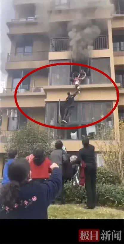“来,把孩子交给我!”张裕向楼上居民喊话,3楼的两位大人将小女孩送出阳台外,张裕一只手勾住2楼阳台的屋檐,另一只手成功托住了小女孩,顺势将她抱进了2楼居民家中。