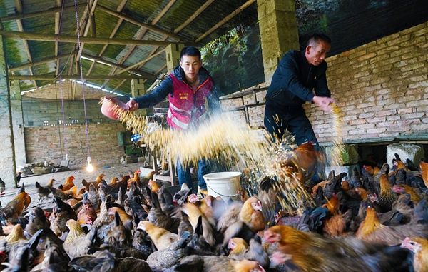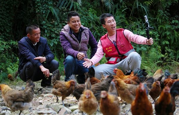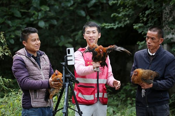 2021年12月9日,广西柳州,融水苗族自治县怀宝镇永和村,廖洲帆与脱贫群众在直播卖“山鸡”。