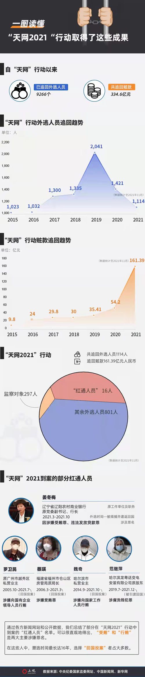 2021年1至11月,“天网2021”行动共追回外逃人员1114人,其中“红通人员”16人,监察对象297人,追回赃款161.39亿元人民币;国家监委对外提出执法合作请求13项、刑事司法协助请求12项……