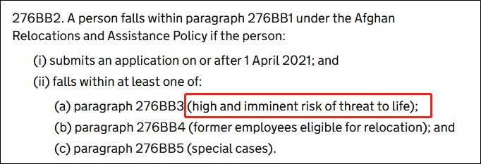 但在英国内政部14日发布的文件中,英方将“迫在眉睫的风险”修改成了“高风险和迫在眉睫的威胁”(high and imminent risk of threat to life)。这意味着英国进一步抬高了阿富汗人的进入门槛,缩小了优惠政策的覆盖面。