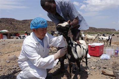 ▲ 中国援非专家肖仁荣正在协助当地村民,给牲畜进行采血检查。