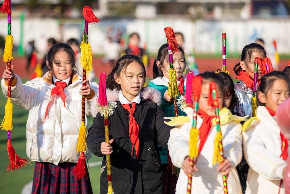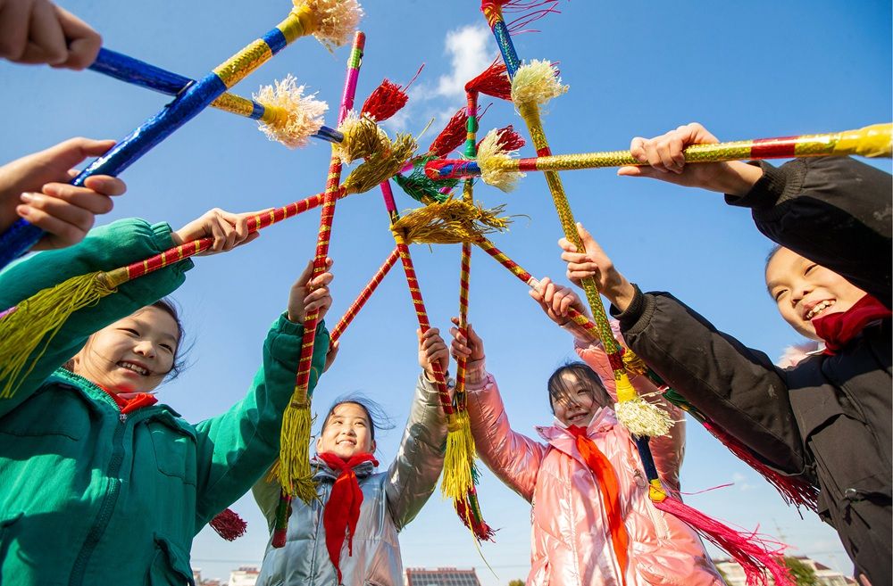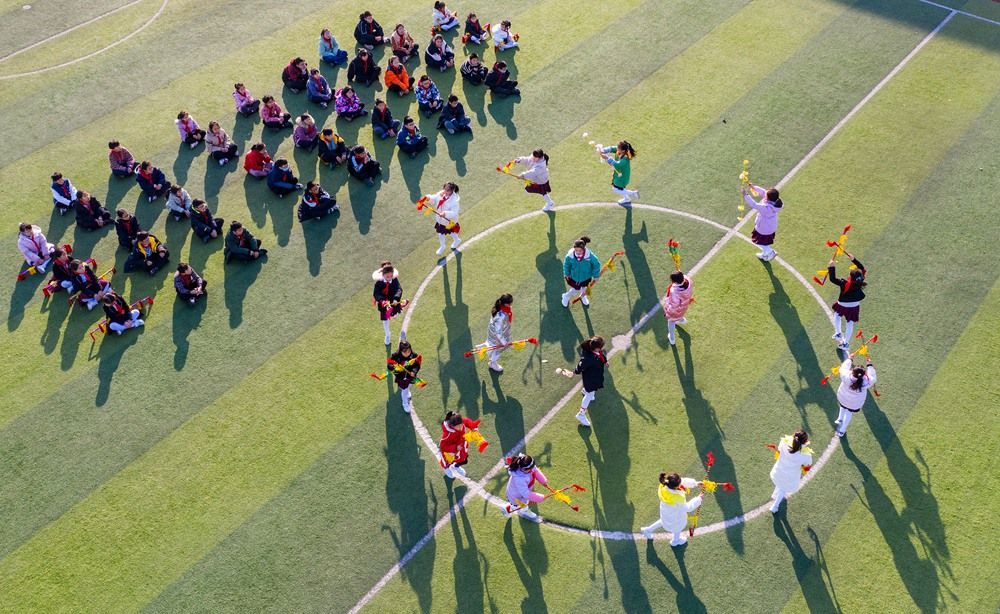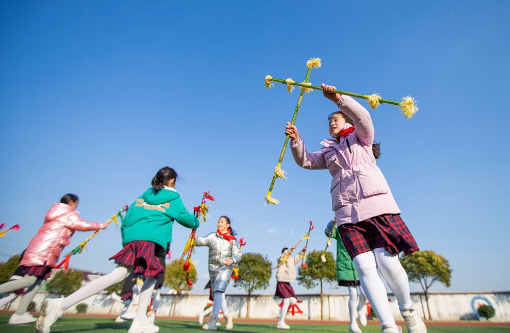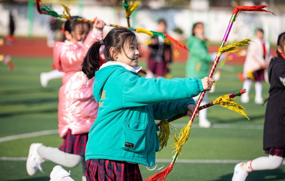 江苏省南通市海安市城东镇西场小学深入推进义务教育“双减”工作,将非物质文化遗产“打连厢”引进校园,把时尚的音乐、舞蹈元素融入其中,在校园延时服务中进行推广,传承传统文化艺术,促进学生身心健康。
