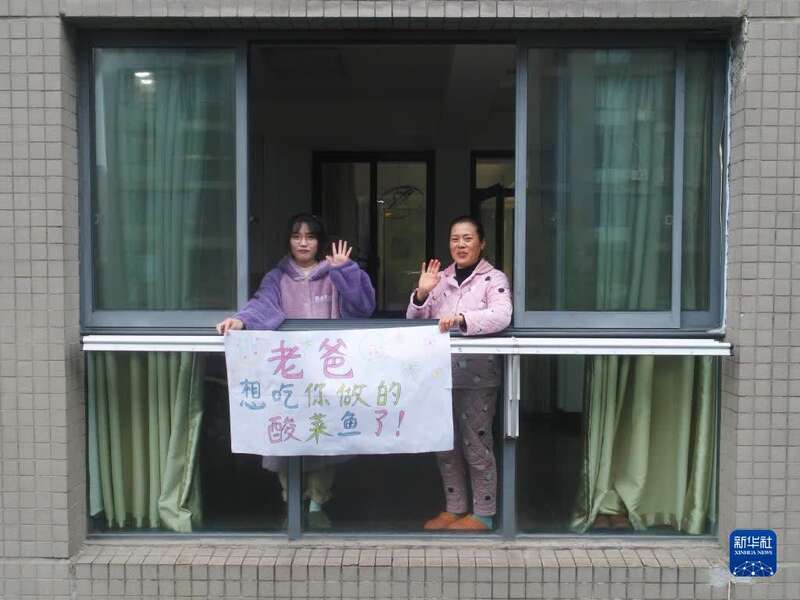 12月16日,大学刚毕业的顾小姐(右)和母亲吕女士在家中向在一线抗疫的父亲/丈夫顾先生表达问候(无人机照片)。