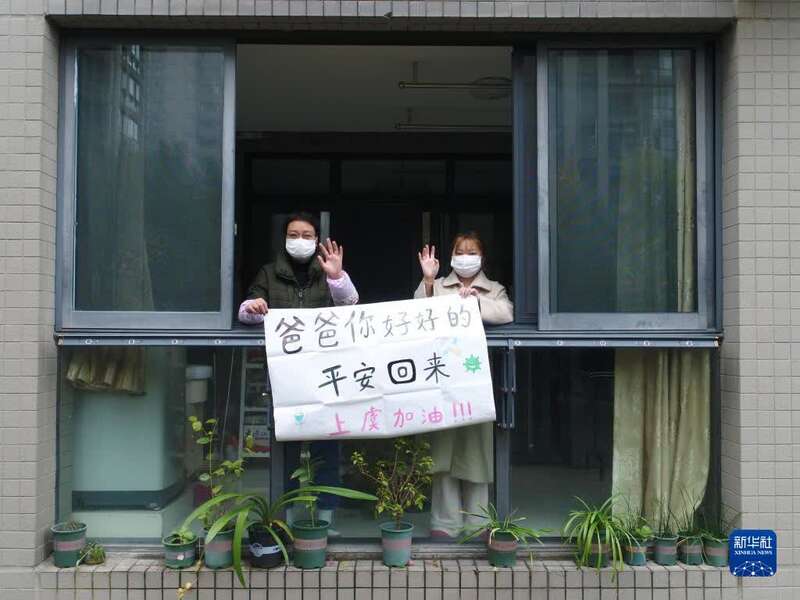 12月16日,中医诊所工作人员石先生和大学刚毕业的女儿向正在参加抗疫的妻子/母亲传达问候。石先生的妻子是上虞一家医院的医生,12月7日离家投入抗疫一线(无人机照片)。