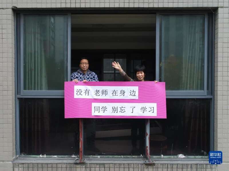 12月16日,同为中学教师的陆先生和妻子谢女士在家中向已经停课的学生们表达问候,希望他们不忘学习(无人机照片)。