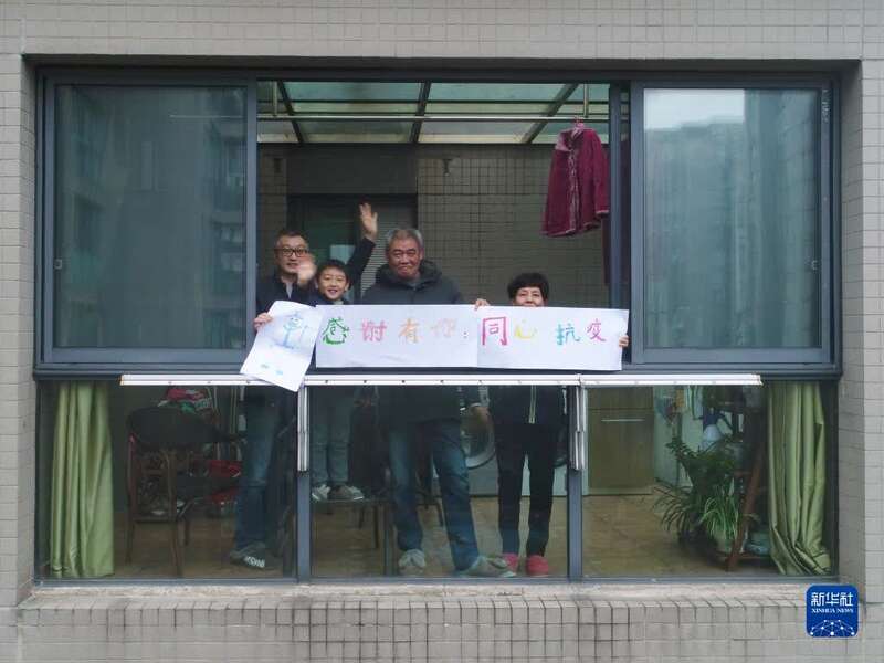 12月16日,公务员崔先生、教师邵女士夫妇和正在读中学的儿子在家中展示他们对医务人员、社区工作者和志愿者的问候(无人机照片)。