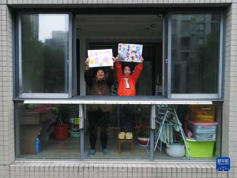 12月16日,喜爱画画的小学生冯若烯和奶奶任女士在家中一起举着画作为战“疫”鼓劲(无人机照片)。