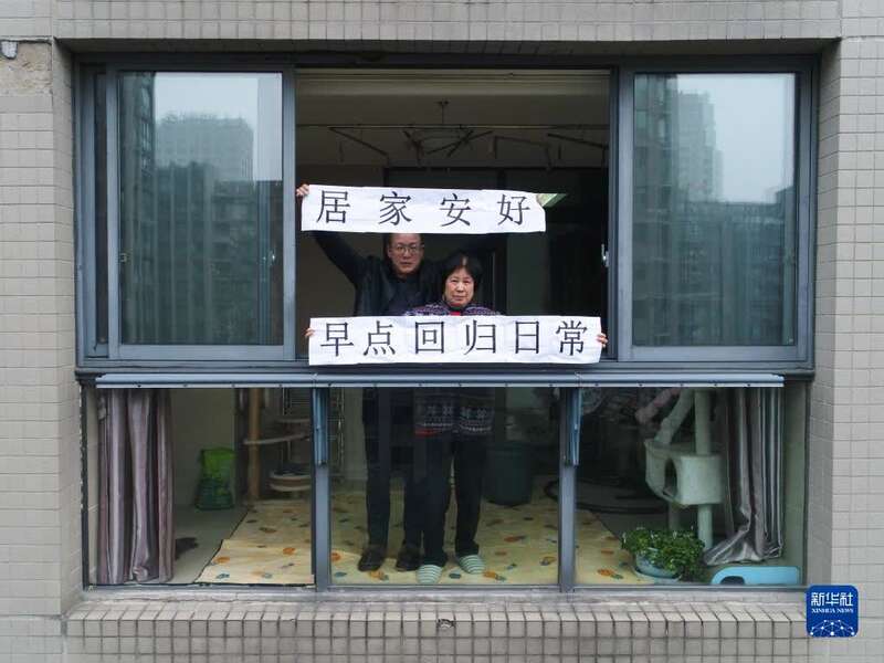 12月16日,退休工人叶先生和妻子陈女士在家中展示他们的问候。两人都曾是军人,他们希望祖国和家乡尽快从这一次的疫情中走出来(无人机照片)。