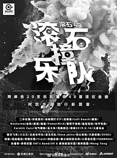 12月3日,随着五首经典翻唱作品在网易云音乐上线,“滚石撞乐队40团拼经典”项目正式启动了,这是“滚石40”系列计划的一部分。不过,这次“滚石40”和之前的“滚石30”“滚石20”有所不同,此前的十年一纪念,通常会集中在对于经典歌曲的回忆以及经典歌手的再次重聚,和许多的纪念活动一样,主要还是想留住那种珍贵的岁月,并且将曾经的美好和当下的人们一起分享。但这次的“滚石40”,则用“滚石撞乐队40团拼经典”这样的概念,让来自中国大陆和台湾地区的各二十支乐队用创新的方式改编滚石唱片历史上的经典之作,从而真正完成音乐的承上启下。于是,在四十首作品中,我们可以听到滚石唱片历史的回响,也能够听到经典旋律被改编后的新气象。