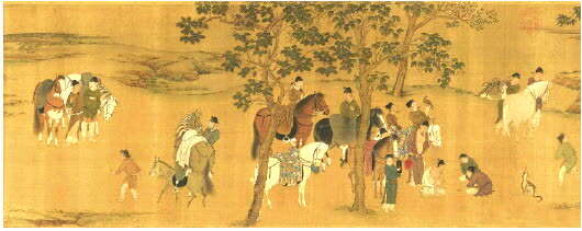 宋徽宗《十八学士图》(局部)台北故宫博物院藏。此图描绘了十八位唐代著名学士游园、赋诗、奏乐、宴饮、戏马、观鹤的生动场景,表现了当时文人学士轻松愉悦的生活趣味。