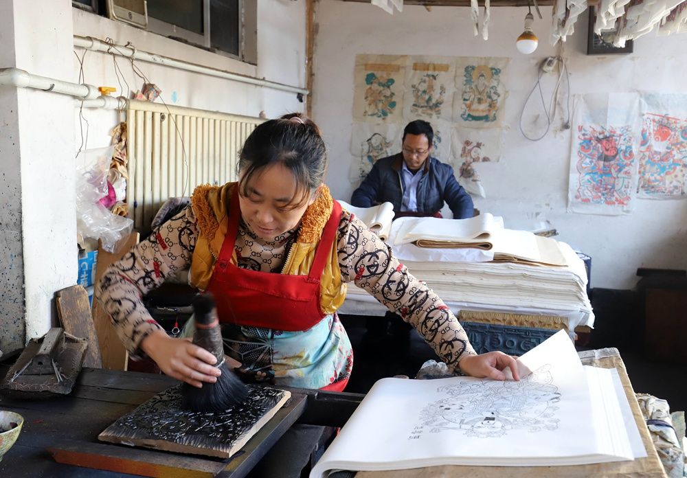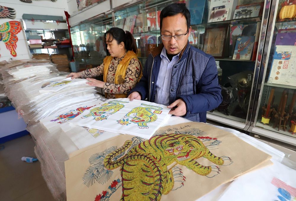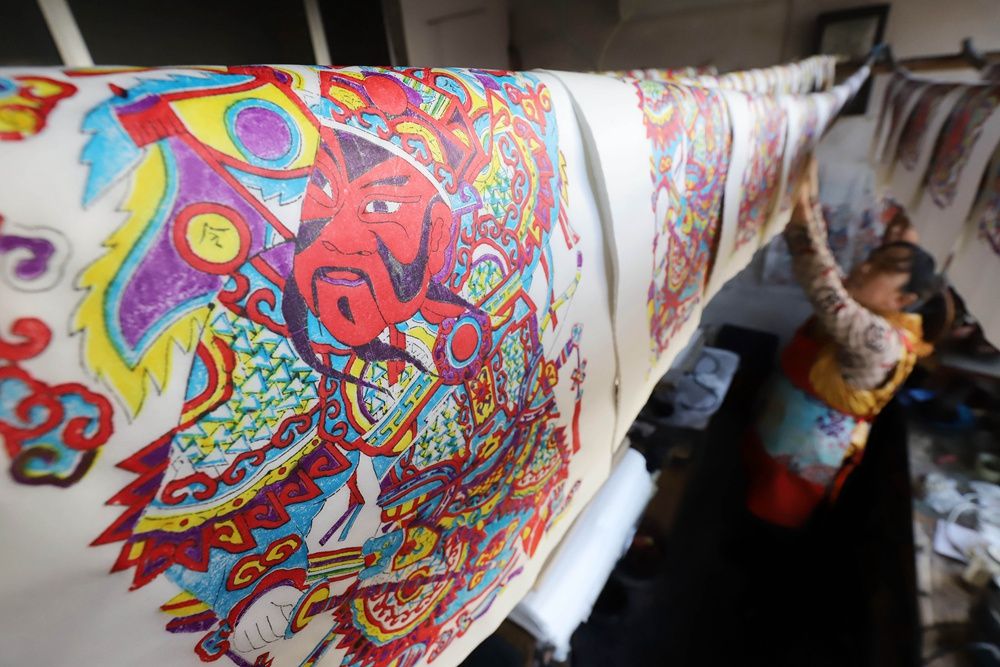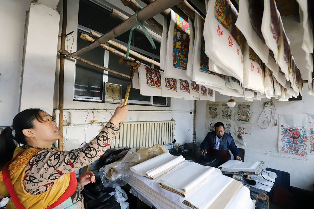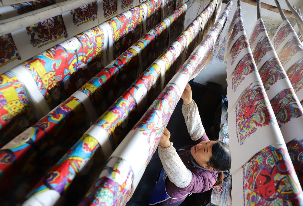 临近新年,在素有“年画之乡”美誉的山东省潍坊市寒亭区杨家埠村,年画艺人们忙着印制木版年画,木版年画经过钩描、刻版、印刷等工序后一幅幅工艺精湛,色彩鲜艳,内容丰富的年画出现在了人们眼前,年画艺人们赶工赶点印制年画以供应节日市场。