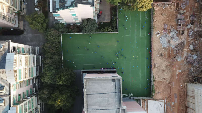 从空中俯瞰,就会发现这所学校的小和特别。除了两栋教学楼,剩下空间全部给了足球——一片没有跑道的七人制球场,一片利用零散空地铺装的凸字形球场。