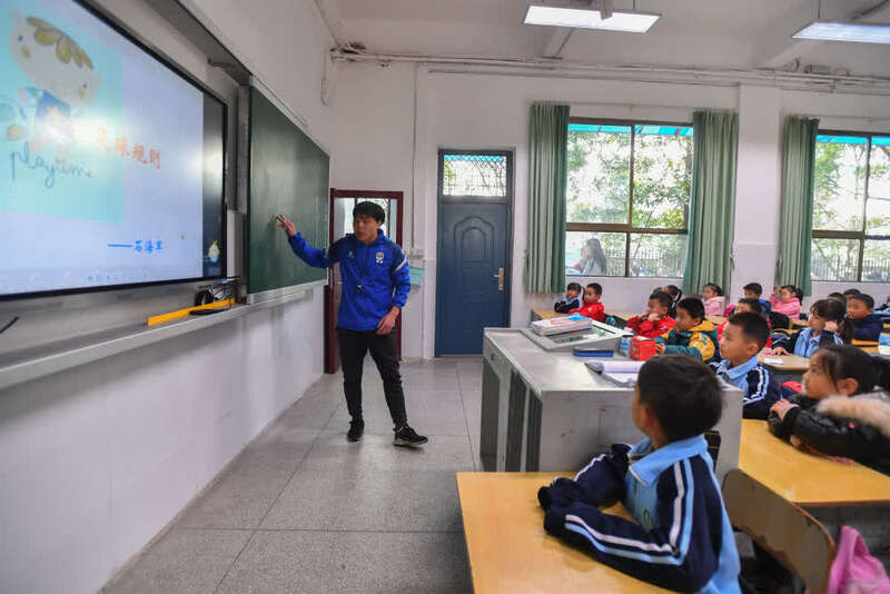 这是教练在给学生教授足球理论课程。新华社记者陈泽国摄