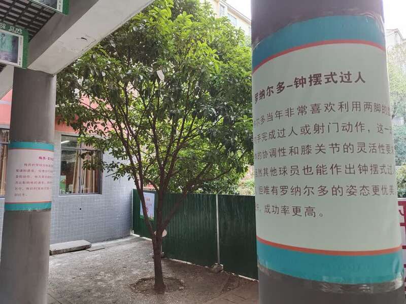 在教学楼的墙上和立柱上,展示着孩子们创作的足球漫画和球员剪纸,还张贴着“钟摆过人”“彩虹过人”“牛尾巴过人”等不同球员招牌过人动作的详细介绍。