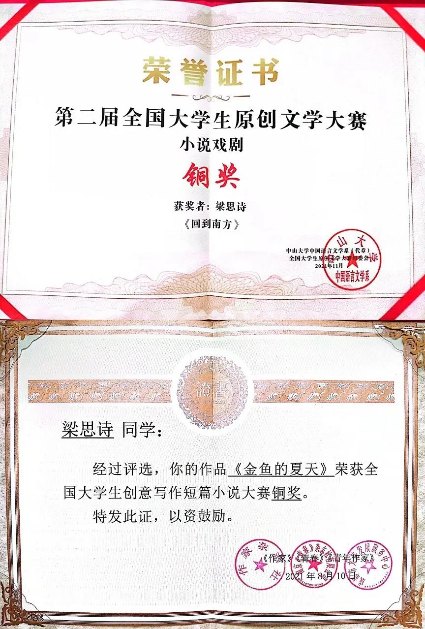 另外,于梁思诗而言,创作也和学业相辅相成。学业上所获的各种理论知识为创作打下了根基,“尤其是接触了古代小说理论后,我对小说的结构和布局有了新的意识,在写作时更像搭建房屋一样去添砖加瓦,而不再是随性地书写。而我的专业也需要在创作中阅读大量文学作品,从各个作家作品中汲取养分。” 就在近日,继“青春文学奖”后,梁思诗又在第二届全国大学生原创文学大赛中斩获铜奖。